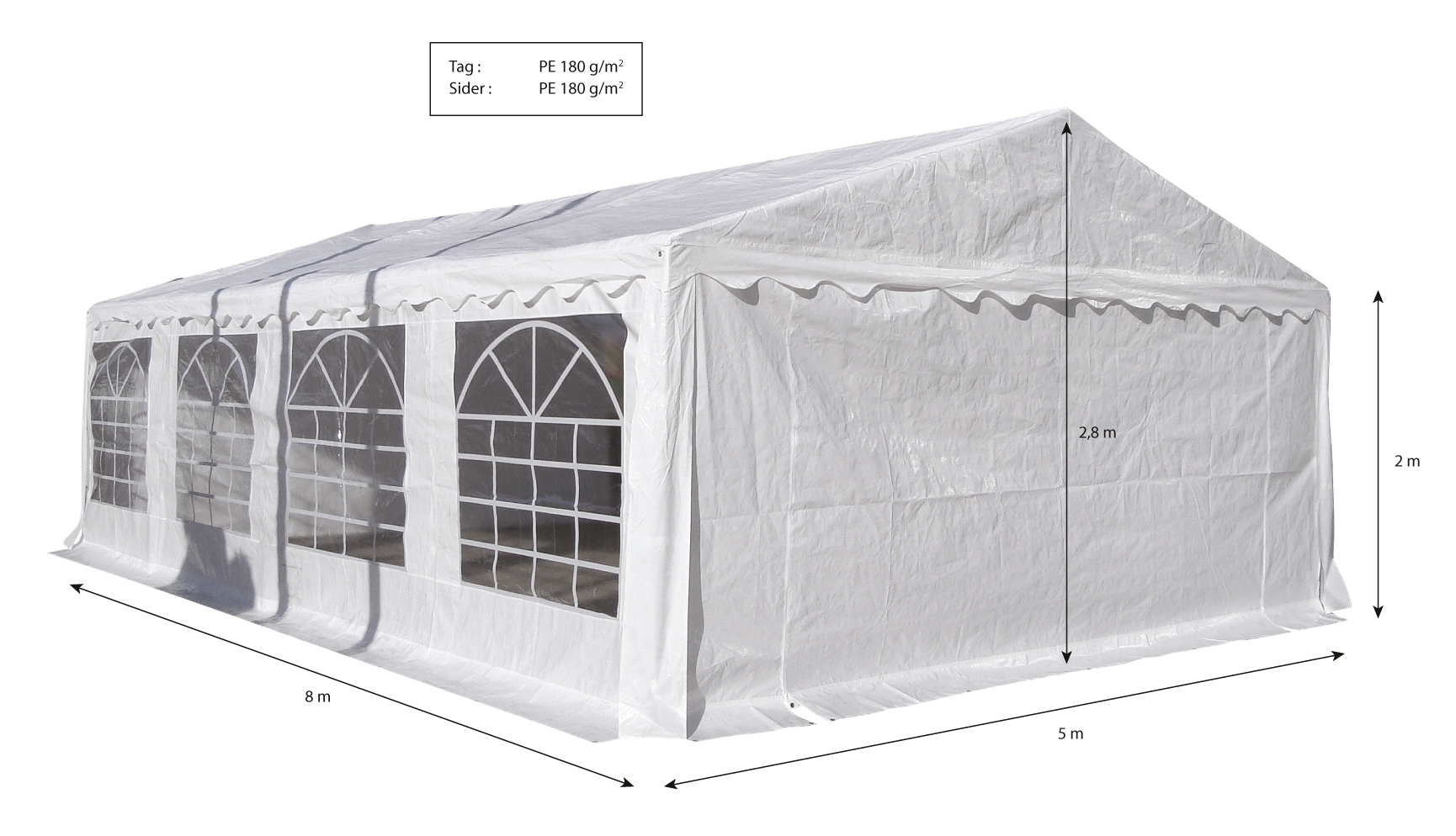 5 X 8 meter. Fås kun online. Komplet partytelt med sider og gavl