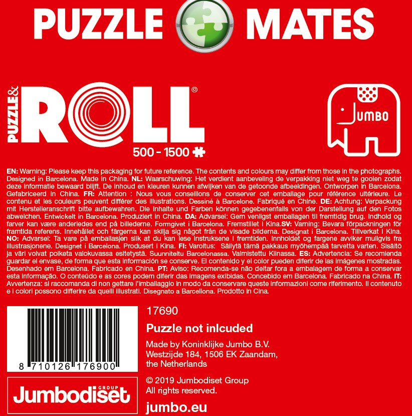 Puzzle & Roll er den nemme måde at opbevare eller bære ufærdige puslespil og løse brikker på. Du skal blot bygge puslespillet på den specialdesignede filt, og når du er klar til at tage en pause eller gemme den væk til en anden dag, ruller du blot filtmåtten rundt om puslespillet og rullerøret og fastgør med de medfølgende stropper. Puslespil og rulle er designet til at opbevare og transportere de fleste standardpuslespil fra 500 til 1500 brikker (op til ca. 90x60 cm).