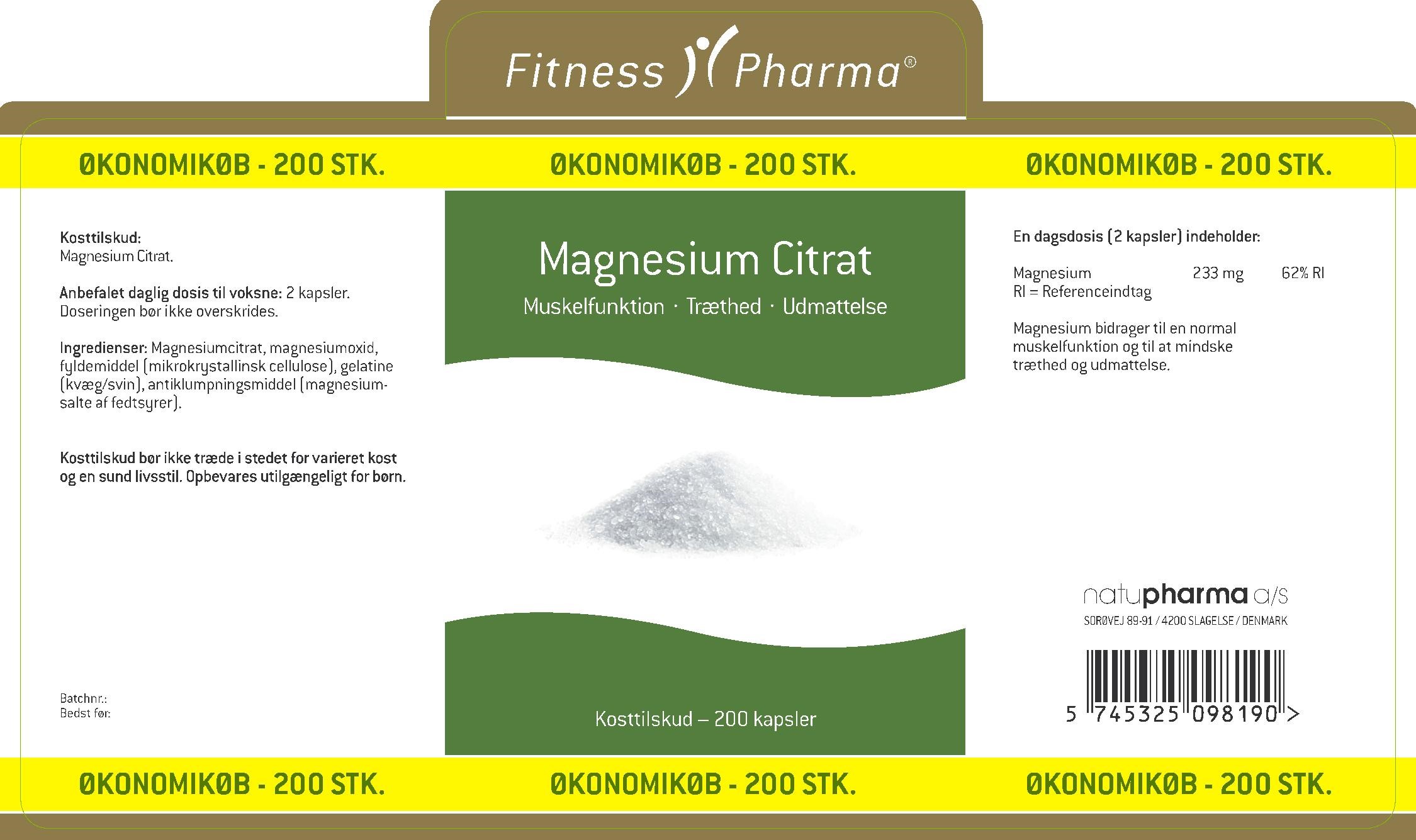 | Ingredienser | Magnesiumcitrat, magnesiumoxid, fyldemiddel (mikrokrystallinsk cellulose), gelatine (kvæg/svin), antiklumpningsmiddel (magnesiumsalte af fedtsyrer). |
