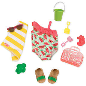 Sand og en masse sjov på stranden! Inklusiv: 1 badedragt, 1 håndklæde, 1 par solbriller, 1 strandtaske, 1 kurv, 1 skovl, rive, 1 skildpadde sandkasse, 1 søhest sandkasse og et par sandaler. Dukke sælges separat