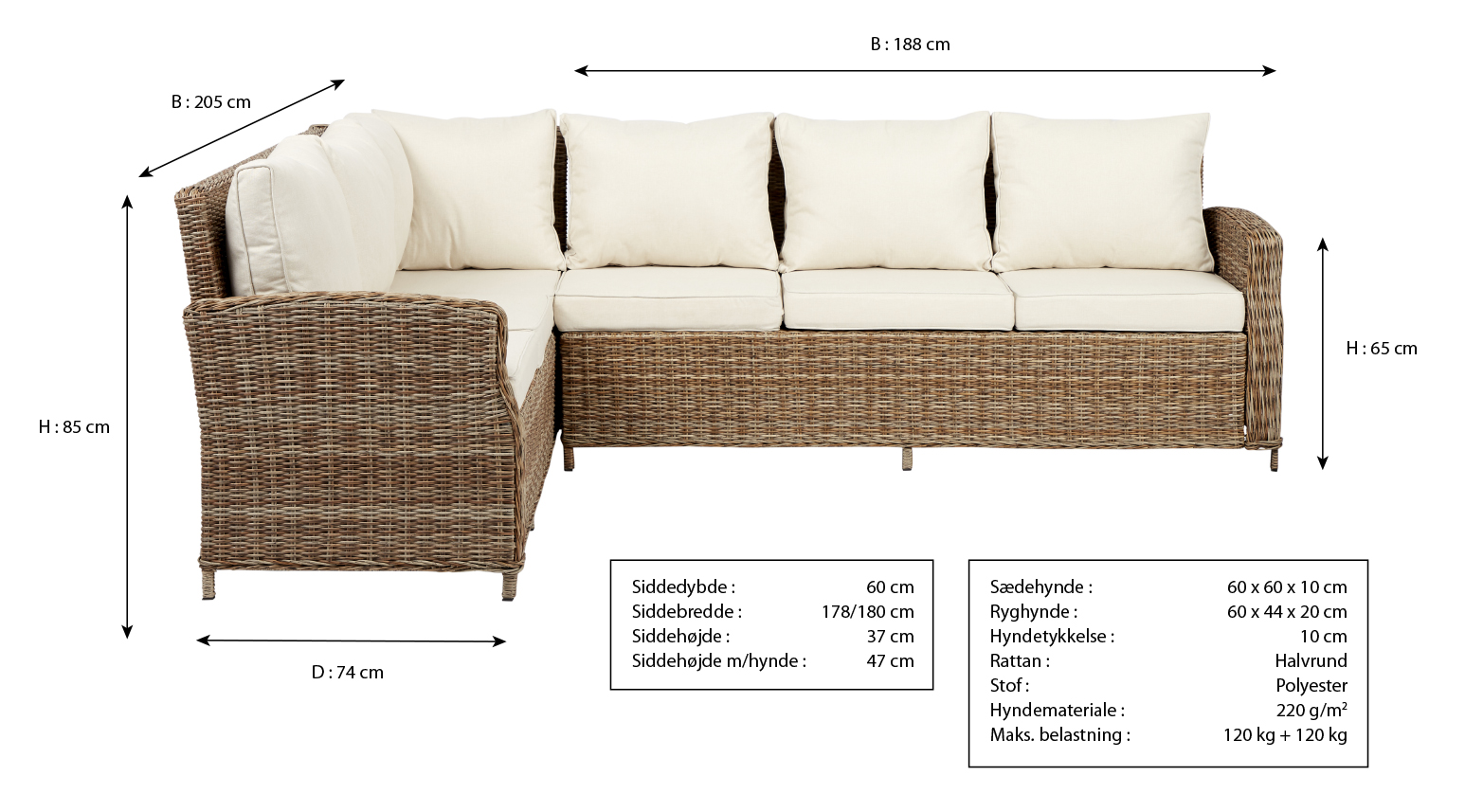 Sofaen måler: L: 203 x B: 262 x H: 85 cm